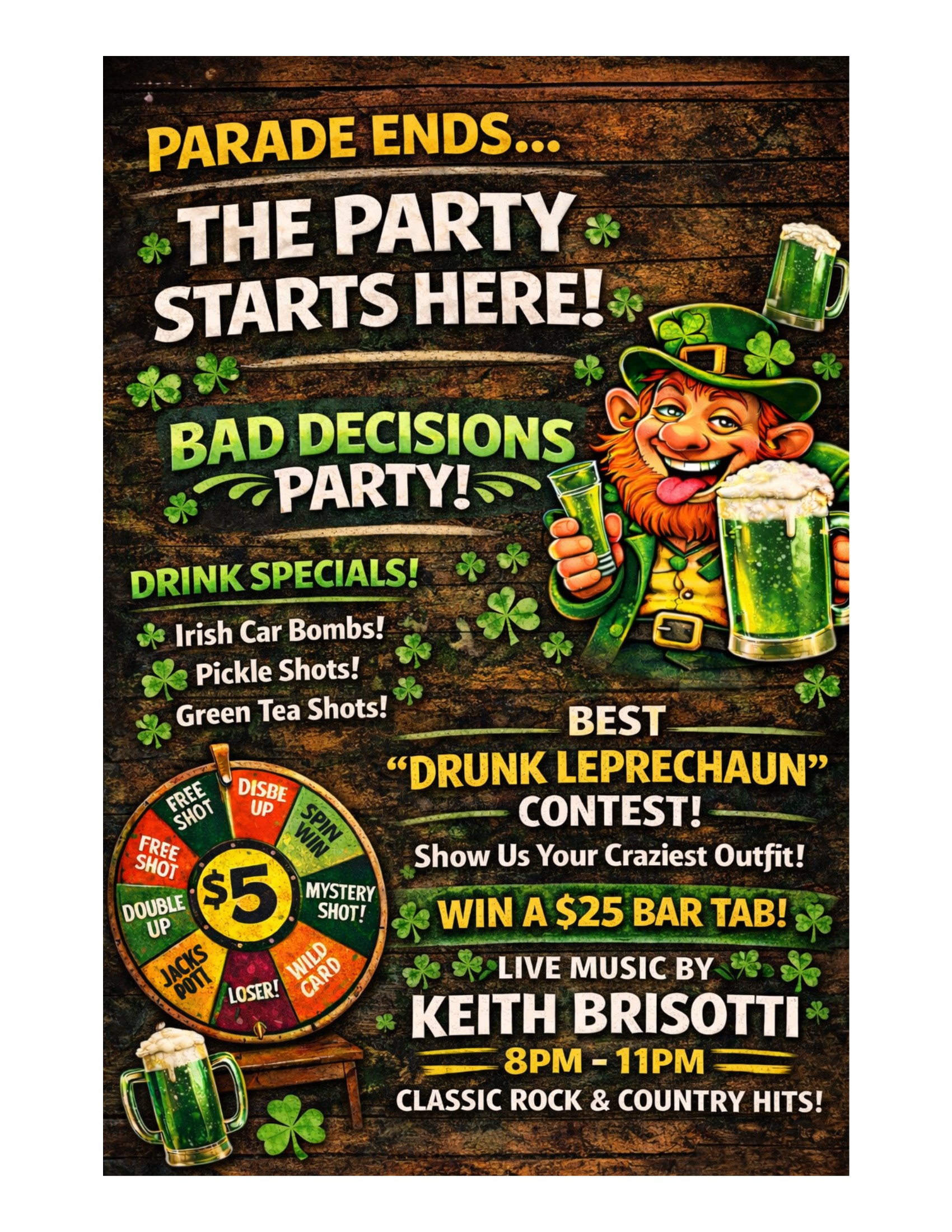 Drink Specials Irish Car Bombs, Pickle Shots & Green Tea Shots $5 each Best Drunk Leprechaun Contest Craziest Outfit Wins a $25 Bar Tab!!!! Live Music by Keith Brisotti 8-11 Classic Rock & Country