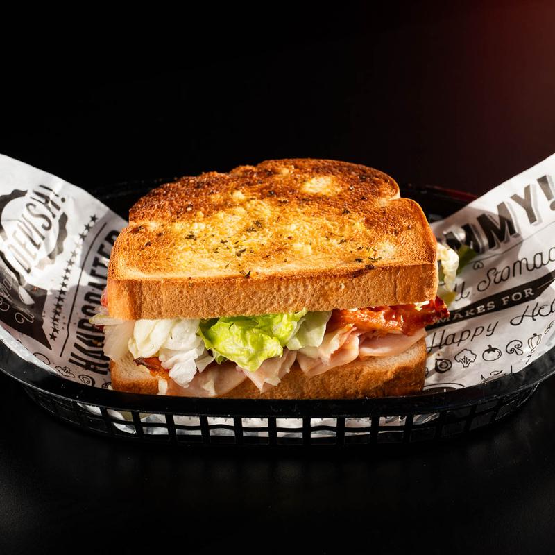 Turkey, bacon, provolone, lettuce, and tomato on garlic Texas toast.
