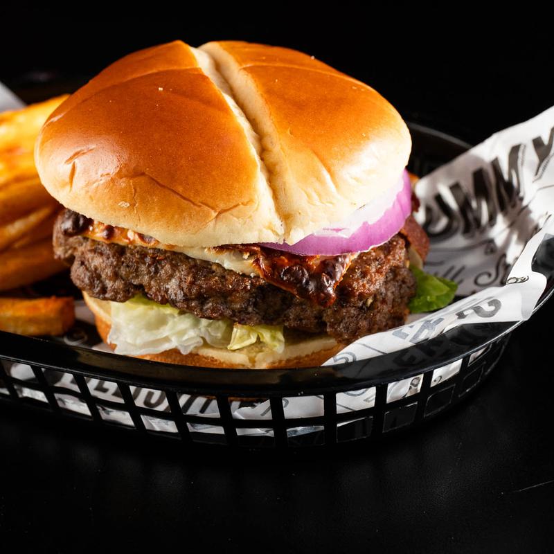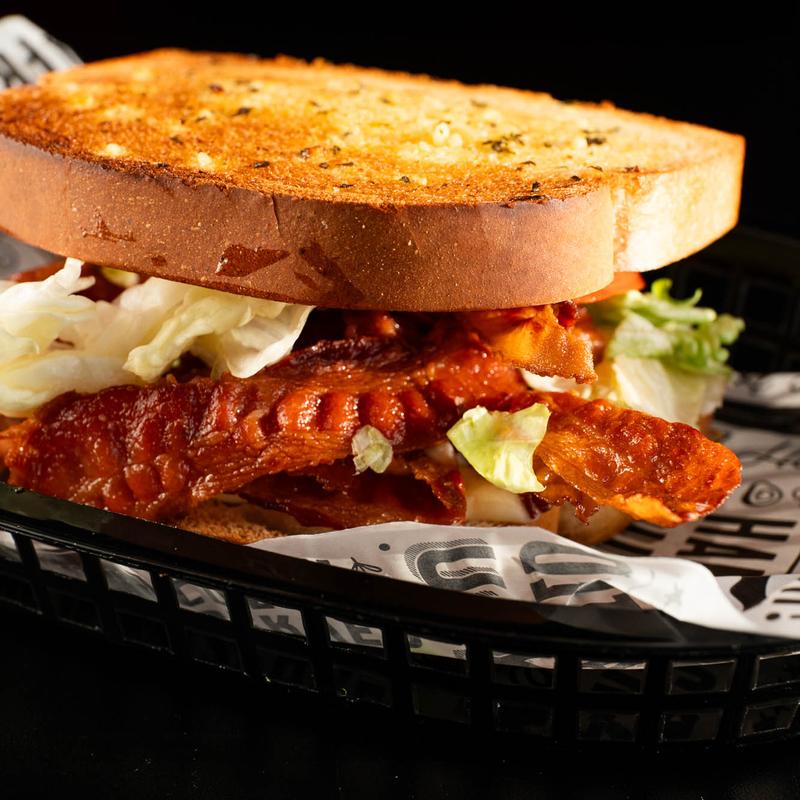 Quarter pound beef, bacon, creamy jalapeño Pixel Sauce, American cheese, tomato, and red onion on garlic Texas toast.